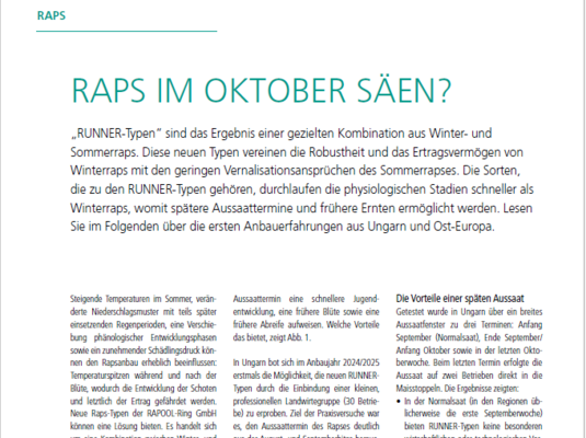 „RUNNER-Typen“ sind das Ergebnis einer gezielten Kombination aus Winter- und Sommerraps. Diese neuen Typen vereinen die Robustheit und das Ertragsvermögen von Winterraps mit den geringen Vernalisationsansprüchen des Sommerrapses. Die Sorten, die zu den RUNNER-Typen gehören, durchlaufen die physiologischen Stadien schneller als Winterraps, womit spätere Aussaattermine und frühere Ernten ermöglicht werden. Lesen Sie im Folgenden über die ersten Anbauerfahrungen aus Ungarn und Ost-Europa.