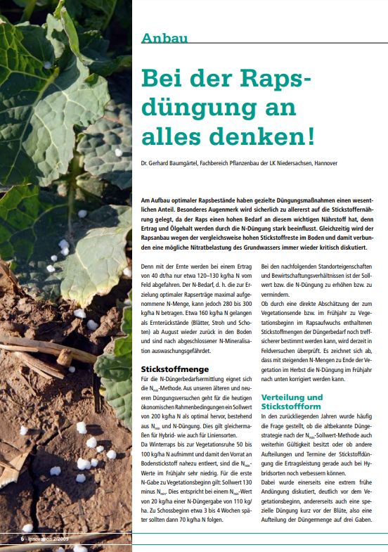 Am Aufbau optimaler Rapsbestände haben gezielte Düngungsmaßnahmen einen wesentlichen Anteil. Besonderes Augenmerk wird sicherlich zu allererst auf die Stickstoffernährung gelegt, da der Raps einen hohen Bedarf an diesem wichtigen Nährstoff hat, denn Ertrag und Ölgehalt werden durch die N-Düngung stark beeinflusst. Gleichzeitig wird der Rapsanbau wegen der vergleichsweise hohen Stickstoffreste im Boden und damit verbunden eine mögliche Nitratbelastung des Grundwassers immer wieder kritisch diskutiert.