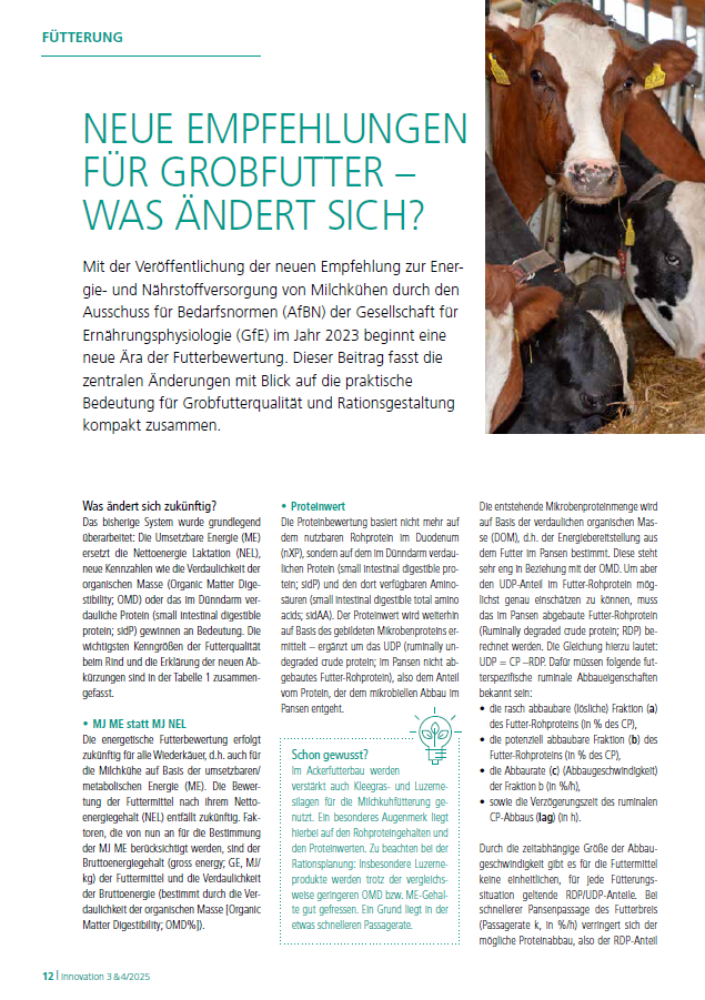 Mit der Veröffentlichung der neuen Empfehlung zur Energie- und Nährstoffversorgung von Milchkühen durch den Ausschuss für Bedarfsnormen (AfBN) der Gesellschaft für Ernährungsphysiologie (GfE) im Jahr 2023 beginnt eine neue Ära der Futterbewertung. Dieser Beitrag fasst die zentralen Änderungen mit Blick auf die praktische Bedeutung für Grobfutterqualität und Rationsgestaltung kompakt zusammen.