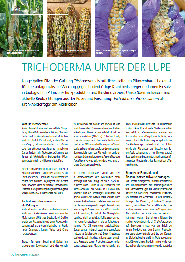 Lange galten Pilze der Gattung Trichoderma als nützliche Helfer im Pflanzenbau – bekannt für ihre antagonistische Wirkung gegen bodenbürtige Krankheitserreger und ihren Einsatz in biologischen Pflanzenschutzprodukten und Biostimulanzien. Umso überraschender sind aktuelle Beobachtungen aus der Praxis und Forschung: Trichoderma afroharzianum als Krankheitserreger am Maiskolben.