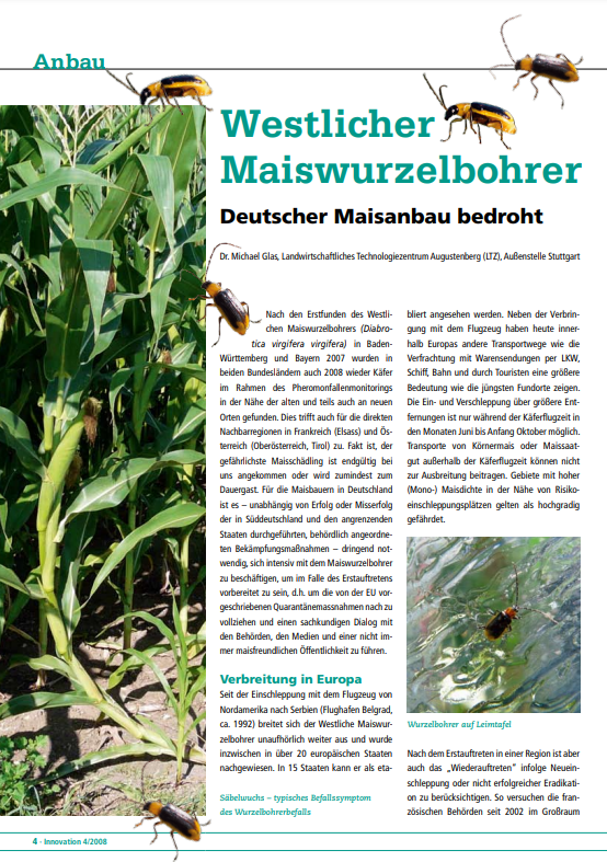 Nach den Erstfunden des Westlichen Maiswurzelbohrers (Diabrotica virgifera virgifera) in Baden-Württemberg und Bayern 2007 wurden in beiden Bundesländern auch 2008 wieder Käfer im Rahmen des Pheromonfallenmonitorings in der Nähe der alten und teils auch an neuen Orten gefunden. Dies trifft auch für die direkten Nachbarregionen in Frankreich (Elsass) und Österreich (Oberösterreich, Tirol) zu. Fakt ist, der gefährlichste Maisschädling ist endgültig bei uns angekommen oder wird zumindest zum Dauergast. Für die Maisbauern in Deutschland ist es – unabhängig von Erfolg oder Misserfolg der in Süddeutschland und den angrenzenden Staaten durchgeführten, behördlich angeordneten Bekämpfungsmaßnahmen – dringend notwendig, sich intensiv mit dem Maiswurzelbohrer zu beschäftigen, um im Falle des Erstauftretens vorbereitet zu sein, d.h. um die von der EU vorgeschriebenen Quarantänemassnahmen nach zu vollziehen und einen sachkundigen Dialog mit den Behörden, den Medien und einer nicht immer maisfreundlichen Öffentlichkeit zu führen.